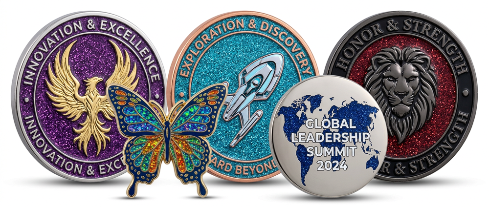 Add some sparkle to your custom lapel pins and challenge coins with our stunning glitter enamel options! Perfect for pride events, celebrations, special editions, or any design that needs to catch the light and turn heads. Our glitter enamel creates a textured, shimmering effect that standard enamel just can’t match.